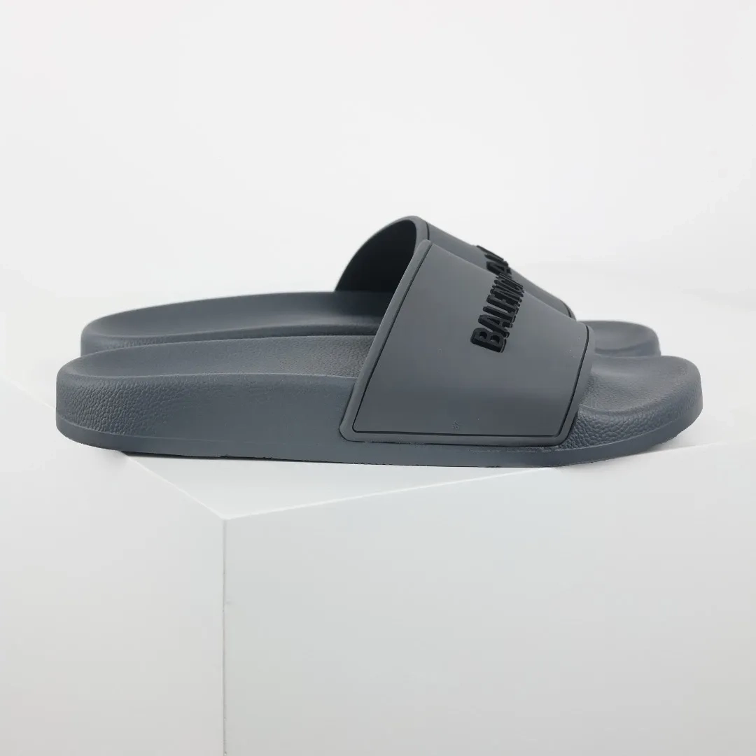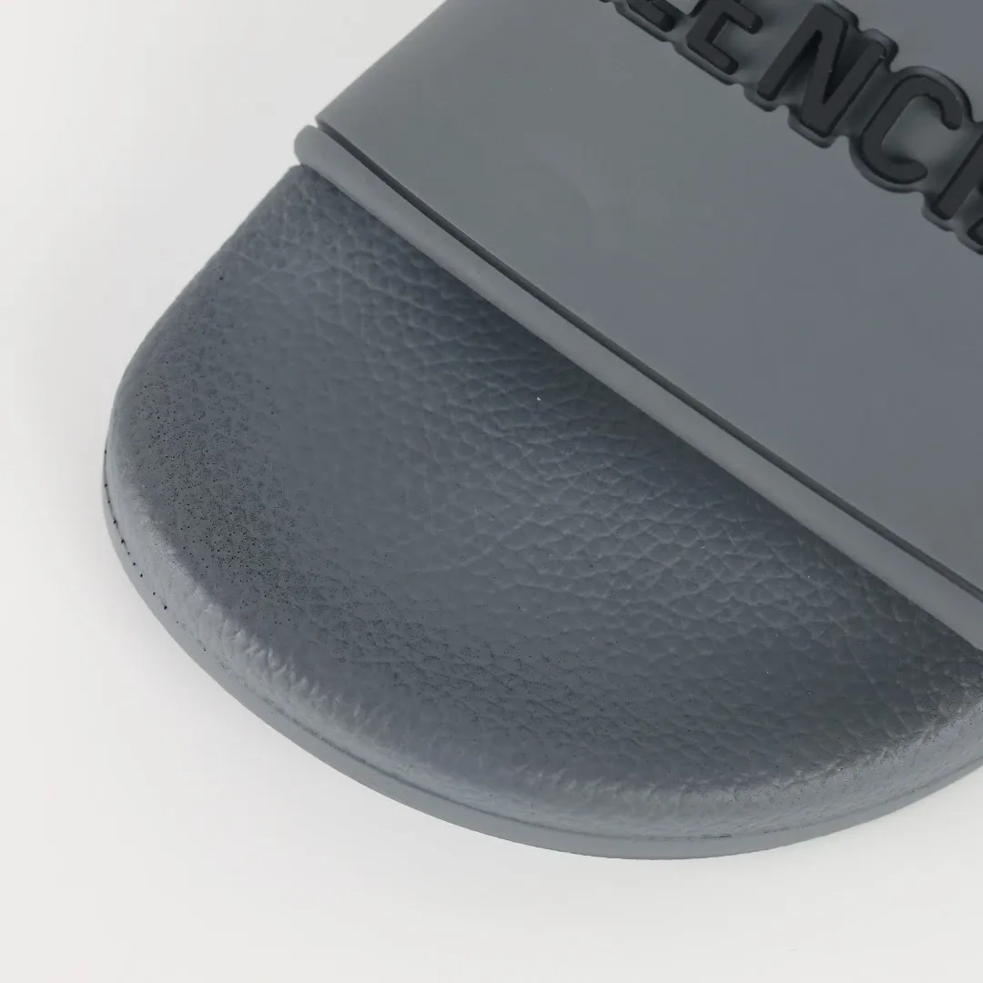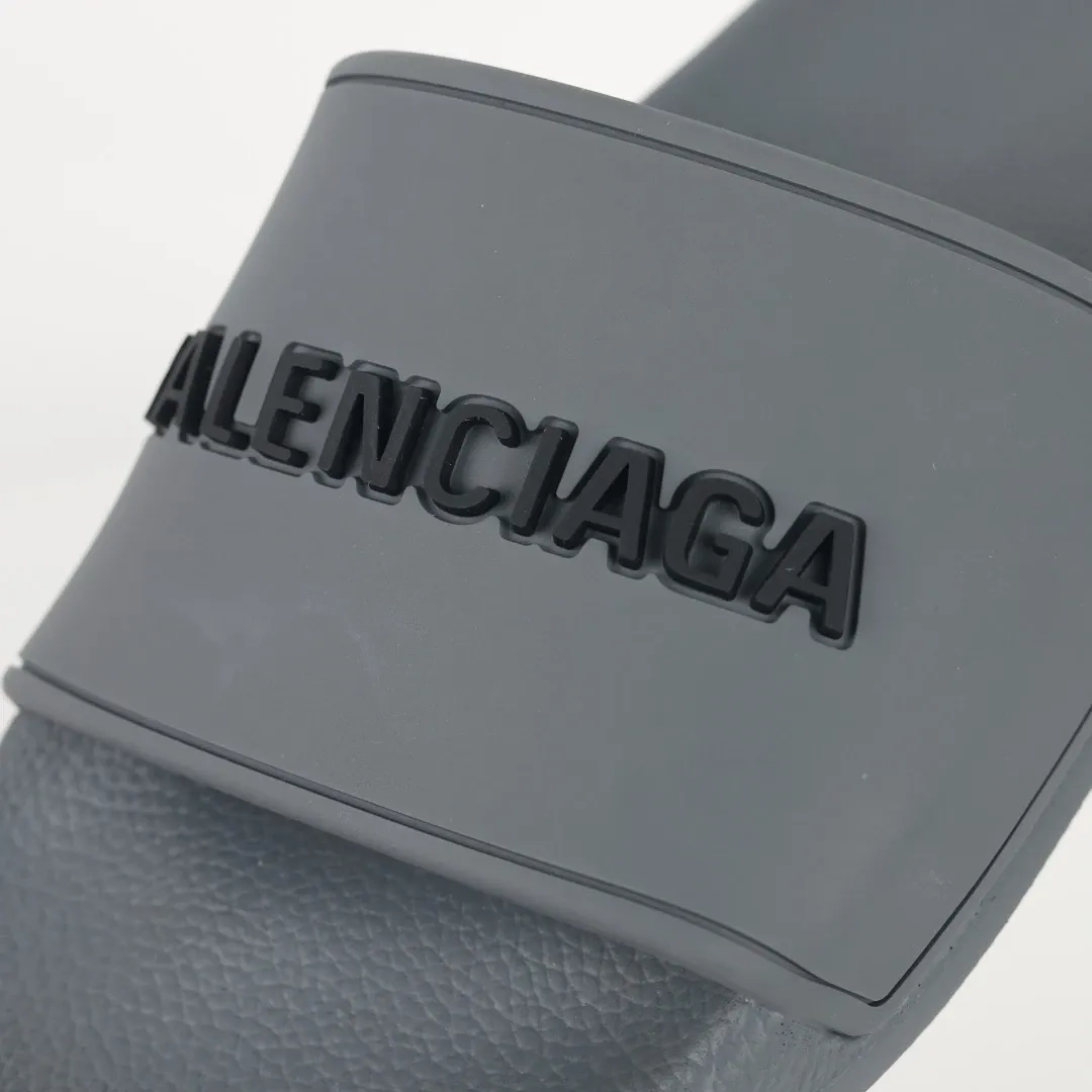 Balenciaga Flip-Flops mit Logo-Print Grey is a modern take on casual footwear, perfect for adding a touch of designer style to your everyday look. These flip-flops feature a sleek grey color with the iconic Balenciaga logo printed prominently on the strap, giving them a trendy and recognizable flair.