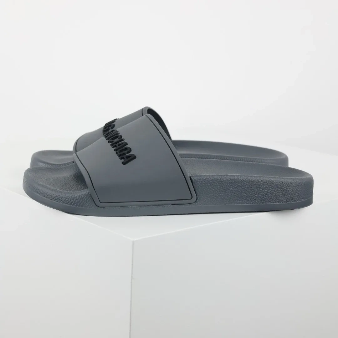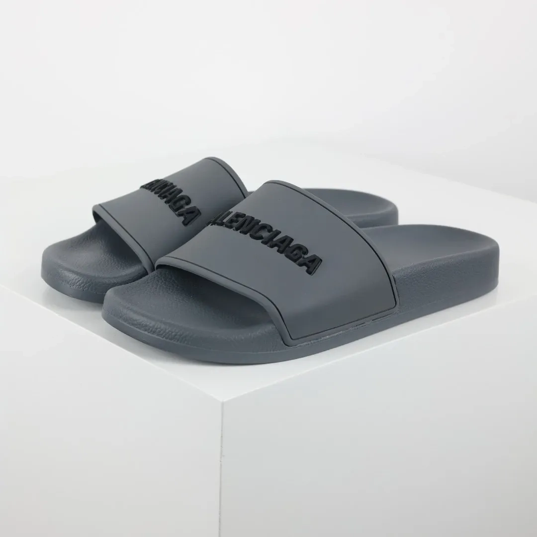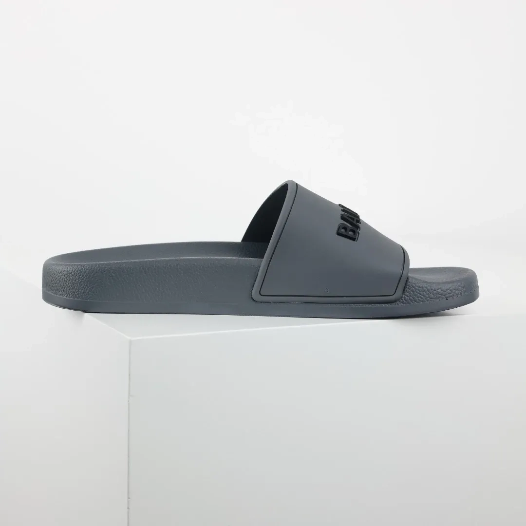 Balenciaga Flip-Flops mit Logo-Print Grey is a modern take on casual footwear, perfect for adding a touch of designer style to your everyday look. These flip-flops feature a sleek grey color with the iconic Balenciaga logo printed prominently on the strap, giving them a trendy and recognizable flair.