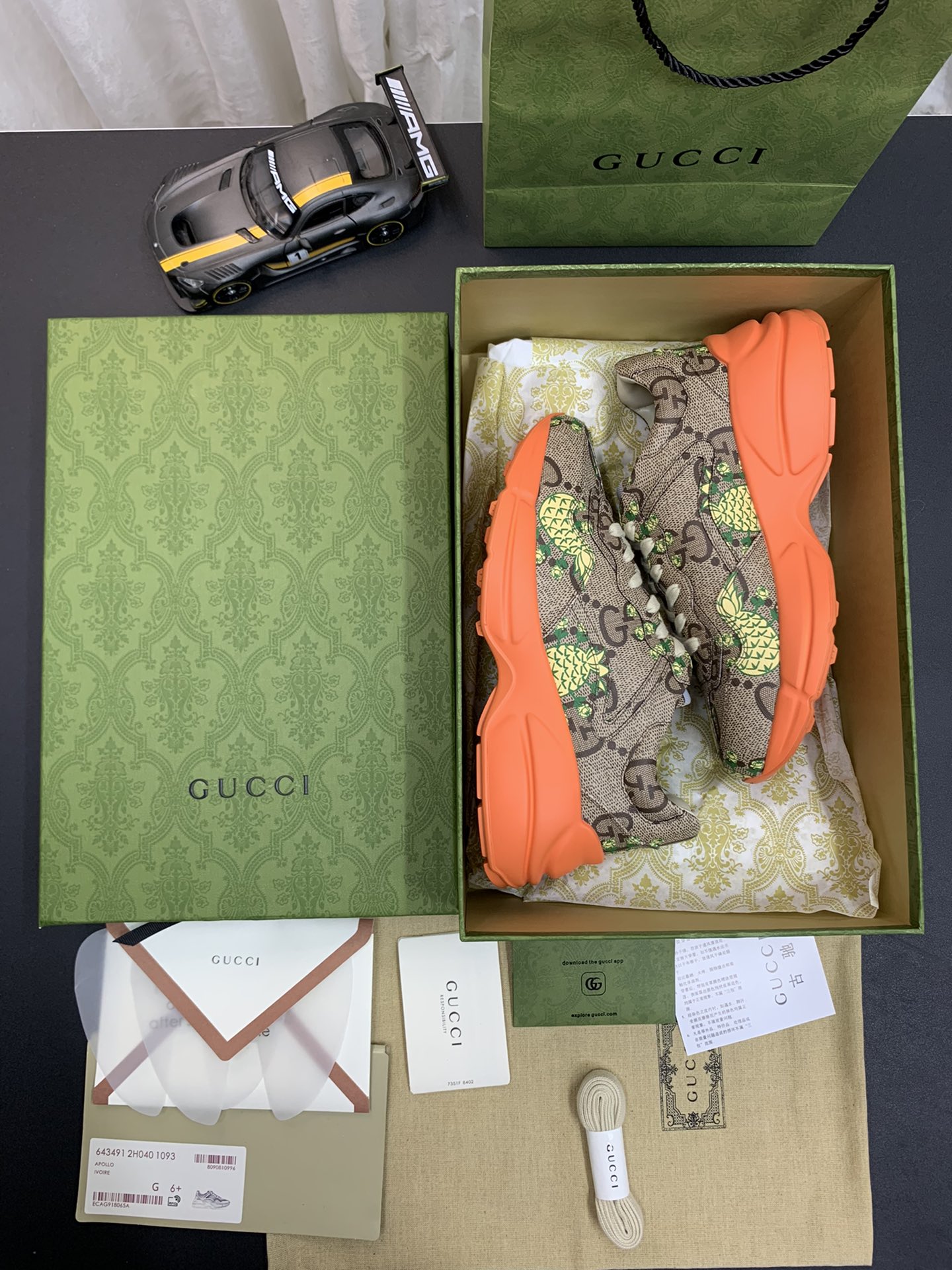 Gucci Rhyton Rep Sneaker – Pineapple is a stylish and trendy sneaker that pays homage to the iconic original design. Crafted with precision and attention to detail, this sneaker features a faithful reinterpretation that combines a retro vibe with a modern touch. The vibrant pineapple color adds a fun and playful twist to your outfit, making it a versatile choice for casual outings or a statement piece in your wardrobe.