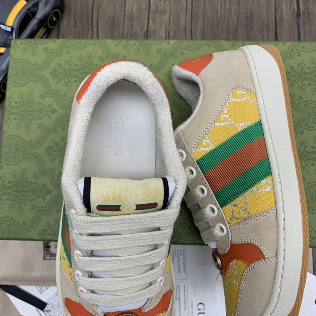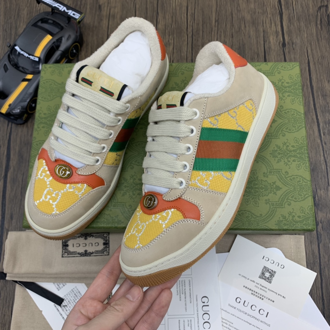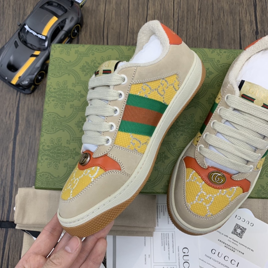 The Gucci Screener Sneaker in Green Yellow is a faithful reinterpretation of the iconic vintage athletic shoe design. Crafted with meticulous attention to detail, this sneaker features a vibrant color combination of green and yellow that adds a bold and modern twist to a classic style. The distressed finish on the leather upper gives it a retro feel, while the GG motif on the sides and vintage logo on the tongue pay homage to Gucci’s heritage. The chunky sole provides comfort and stability, making this sneaker not only stylish but also practical for everyday wear. Whether you’re running errands or meeting friends for a casual outing, these sneakers will elevate your look with an effortlessly cool vibe.