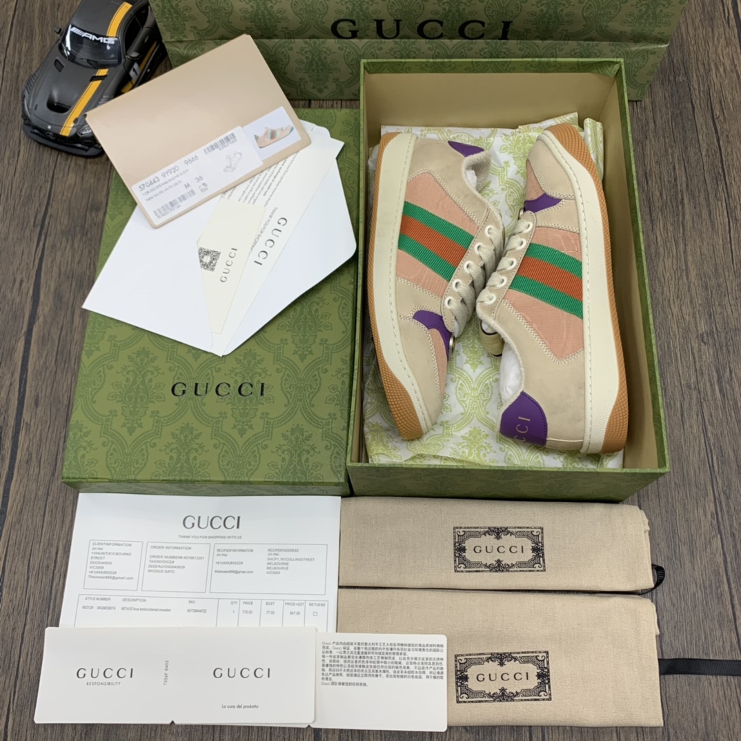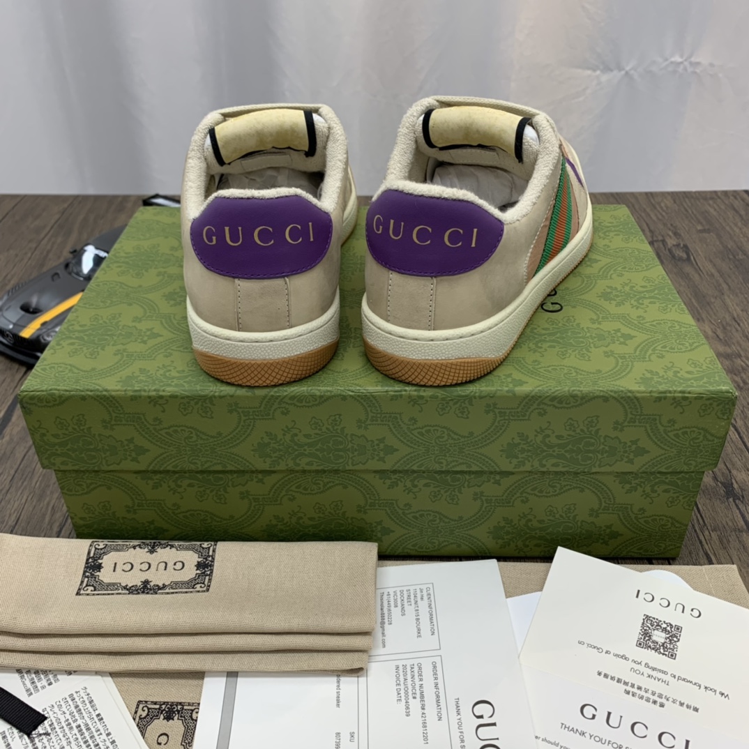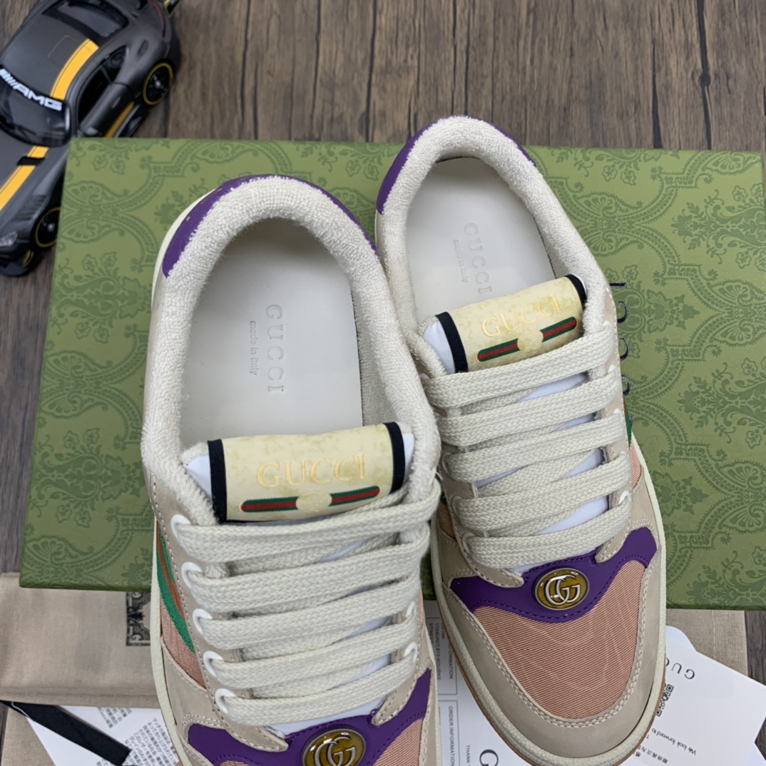The Gucci Screener Sneakers in Green, Tan, and Purple offer a modern twist on a classic design. These sneakers are a faithful reinterpretation of the original style, featuring a unique color combination that adds a fresh and stylish touch to any outfit. The green, tan, and purple hues blend harmoniously, making these sneakers a versatile choice for both casual and smart-casual looks. The iconic Gucci logo is subtly placed on the side, showcasing the brand’s signature elegance.