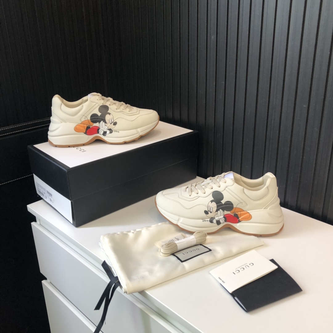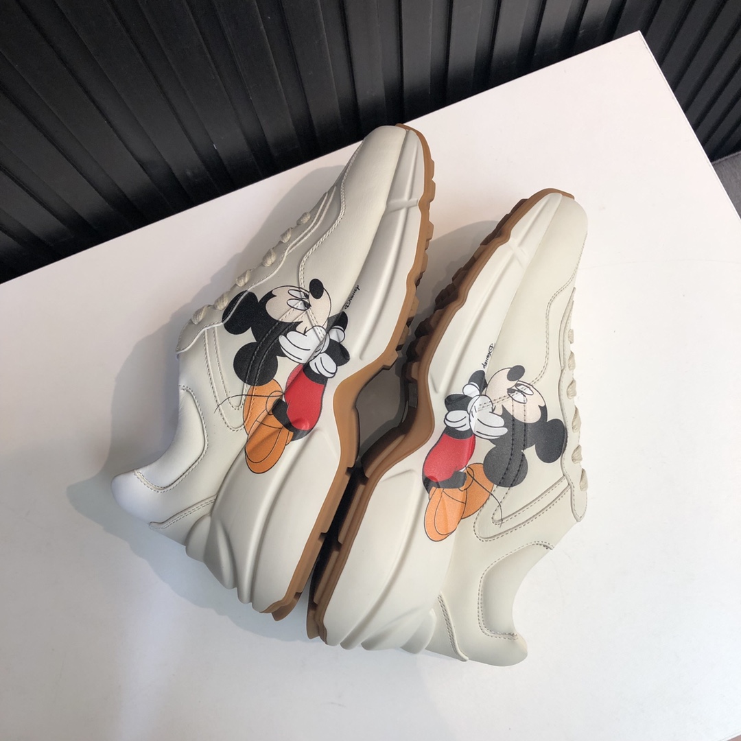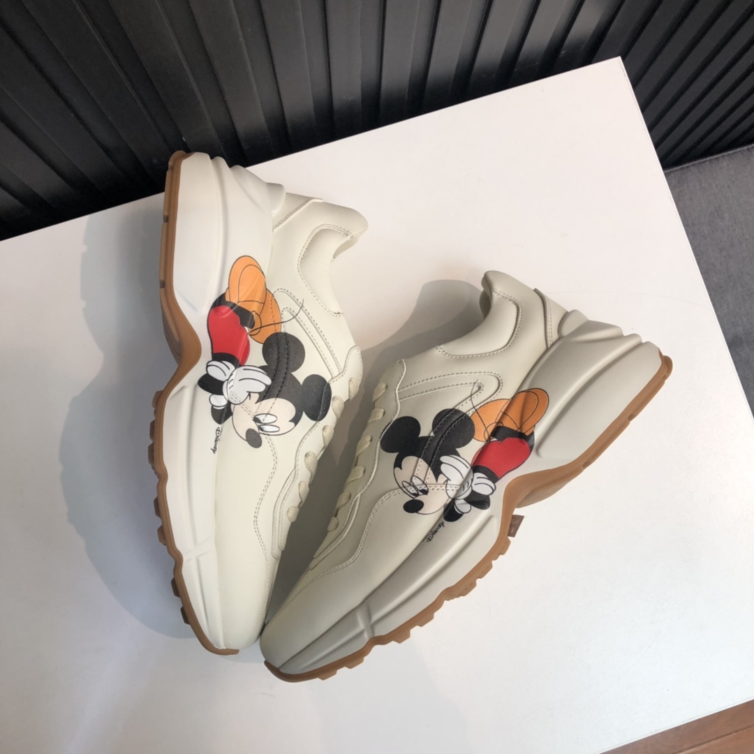 Gucci x Disney Rhyton Mickey Mouse-print Rep Sneaker is a charming blend of luxury and nostalgia. This sneaker captures the essence of childhood memories with its playful Mickey Mouse design, bringing a touch of whimsy to your everyday style. The classic Rhyton silhouette is reimagined with vibrant colors and intricate details that pay homage to the beloved Disney character.