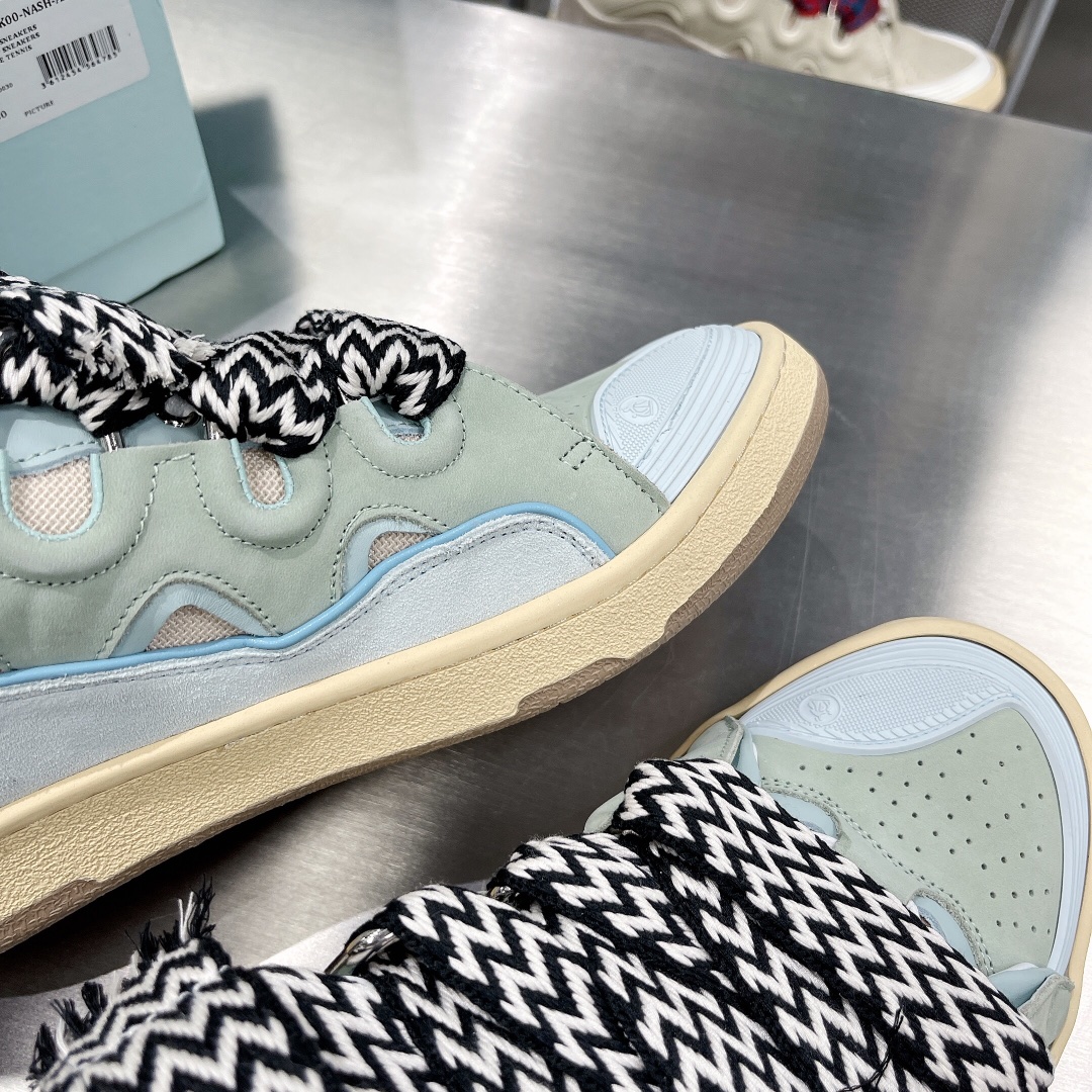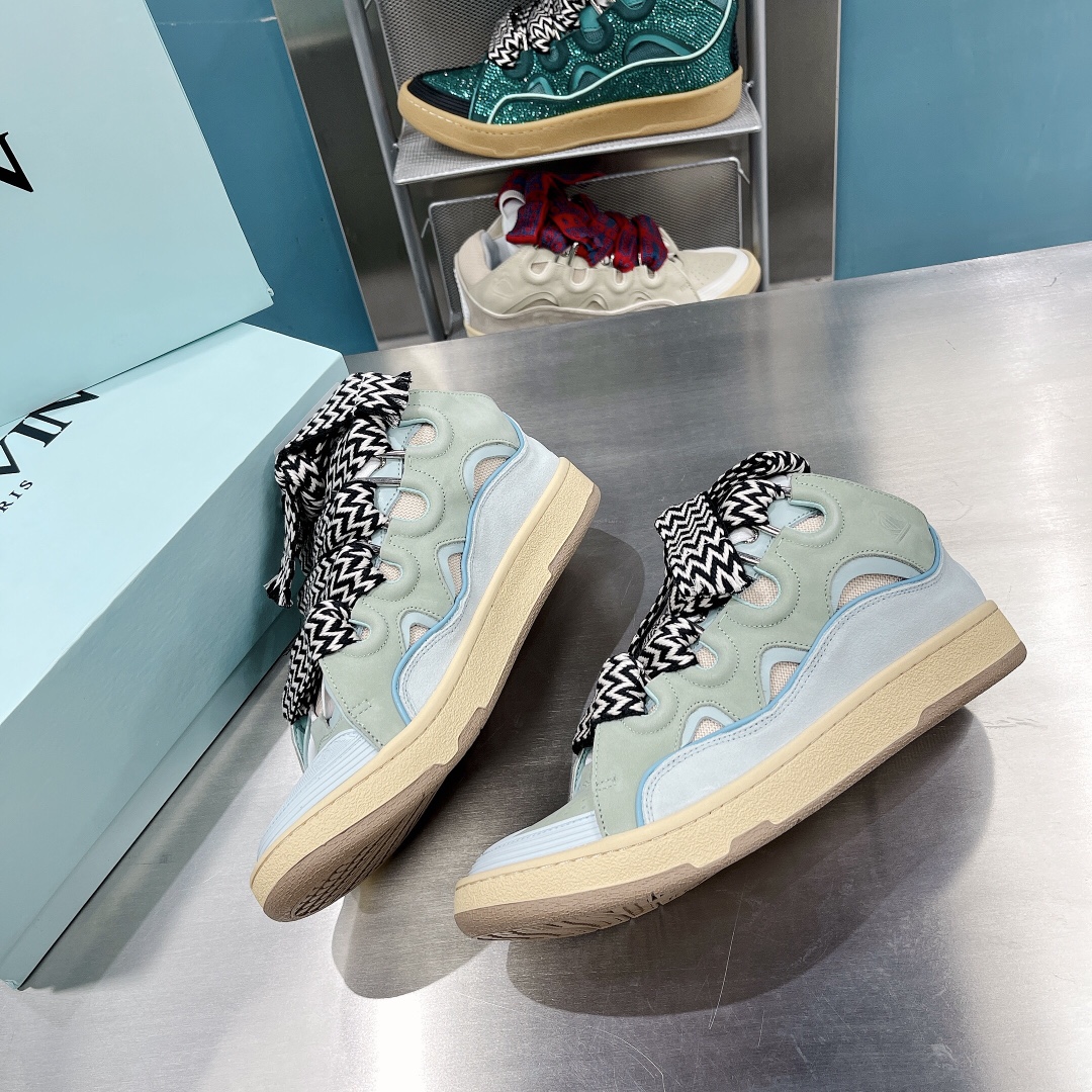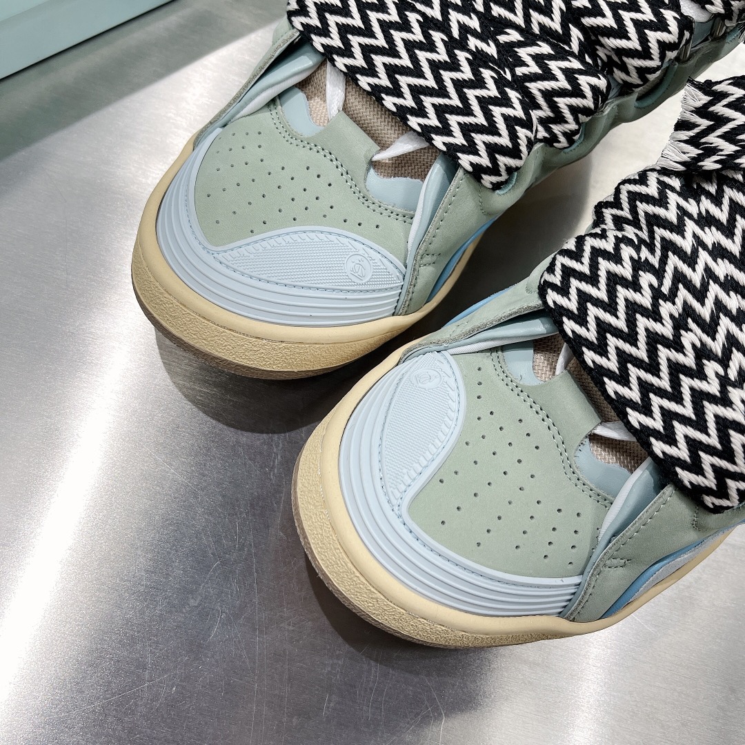 Invest in these LANVIN Leather Curb Sneakers Green/Blue for a stylish and timeless addition to your shoe wardrobe.