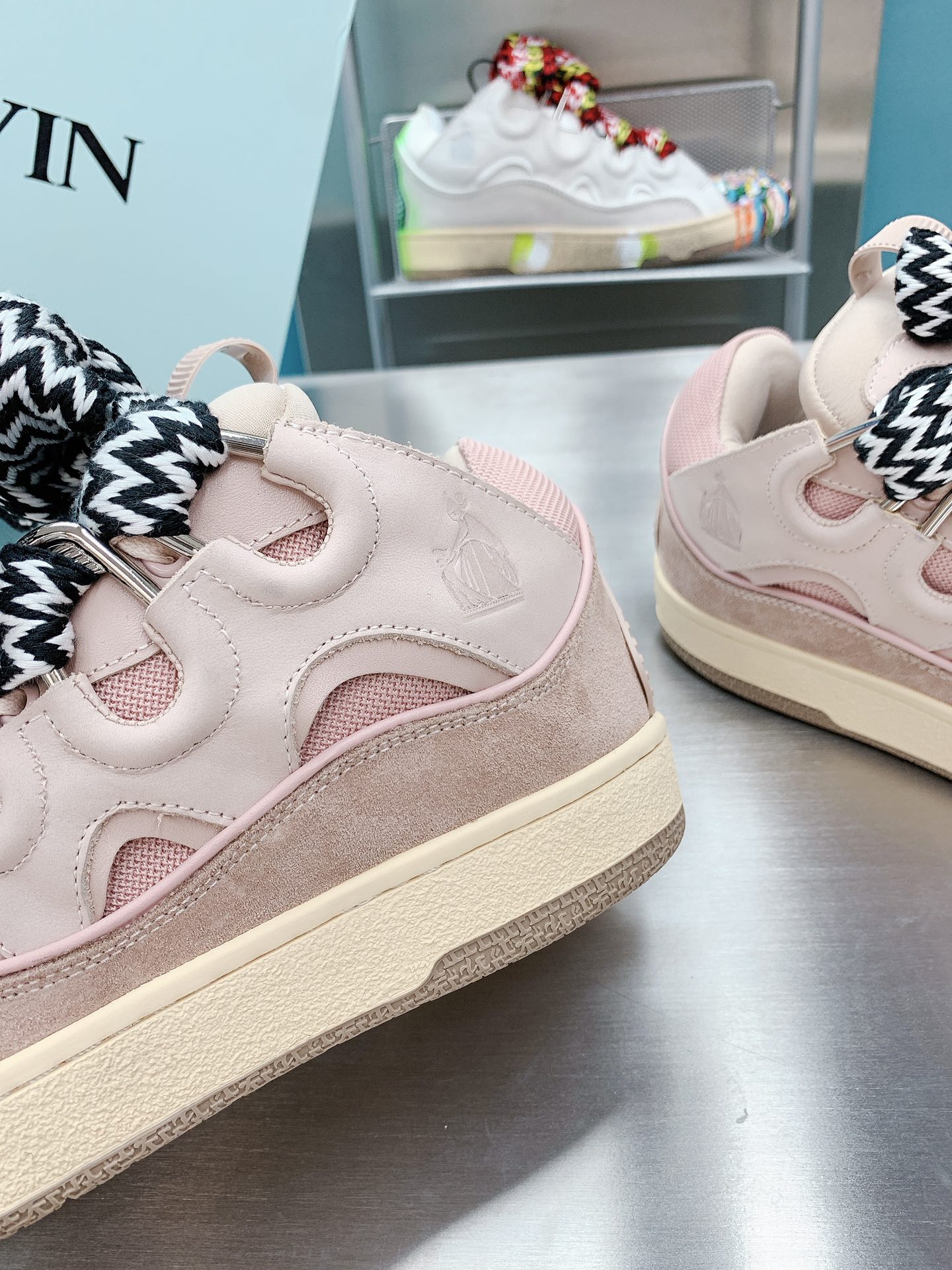 LANVIN Leather Curb Sneakers Pink/Tan offer a contemporary twist on a classic design. These sneakers combine elegance with a touch of playfulness, making them versatile for various outfits and occasions. The soft pink and tan leather exterior exudes a sense of sophistication, while the curb chain detailing adds a modern edge to the overall look.