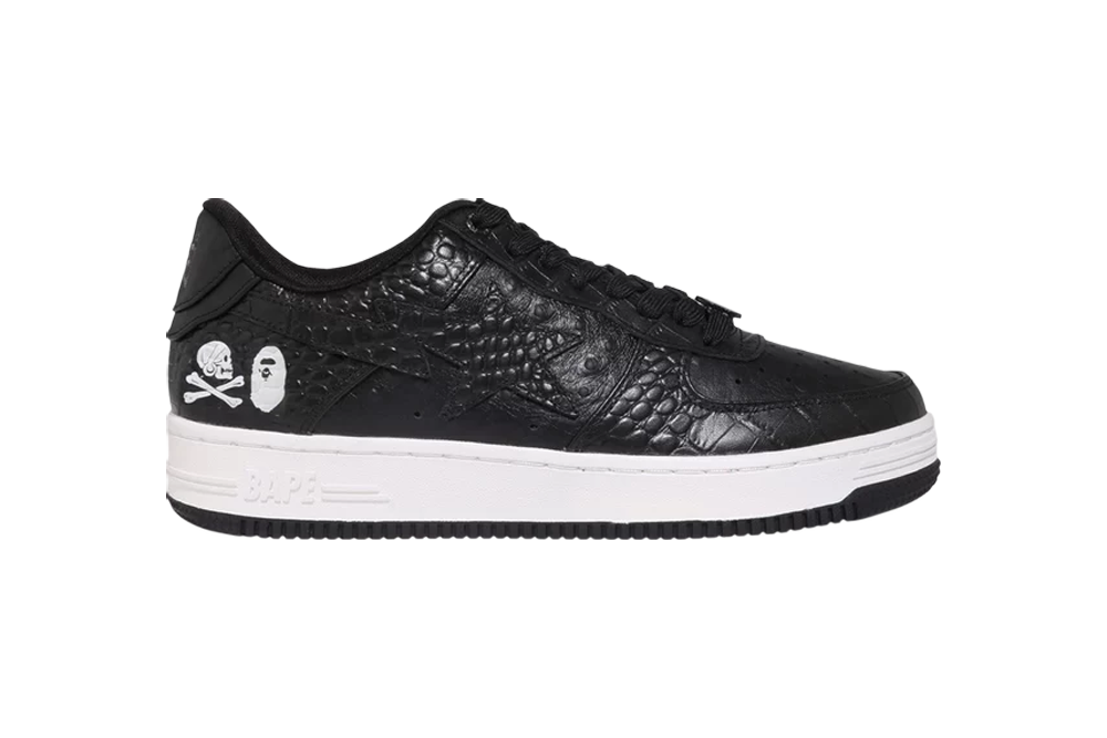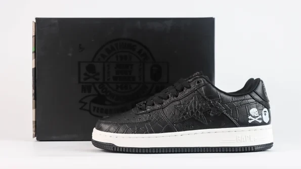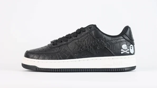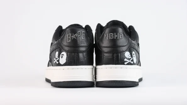 NEIGHBORHOOD×BAPE BAPE STA Black presents a timeless collaboration piece that stays true to the classic aesthetics of the original BAPE STA design. This sneaker features a sleek black leather upper with BAPE’s iconic star logo, complemented by NEIGHBORHOOD’s edgy street style. The BAPE STA’s signature shooting star motif adorns the side, adding a touch of exclusivity. With its clean lines and premium materials, this shoe effortlessly merges modern urban fashion with a touch of nostalgia.